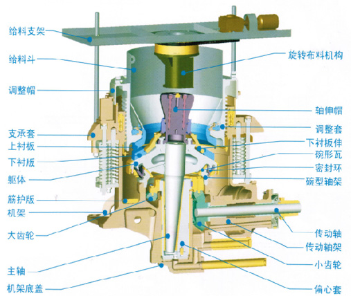 旋盤式破碎機不用于圓錐破碎機。一般圓錐破碎機都是采用破碎執(zhí)行部件直接擠壓物料的破碎。旋盤式破碎機采用的則是“層壓破碎”,就是將破碎機的破碎執(zhí)行部件對物料的擠壓與沖擊作用轉(zhuǎn)變?yōu)槎鄬游锪狭W娱g相互沖擊與研磨的綜合作用,從而實現(xiàn)物料破碎。